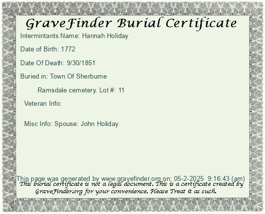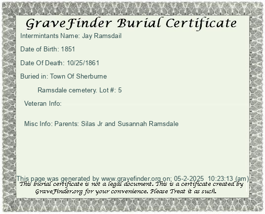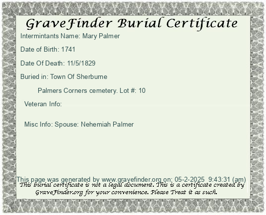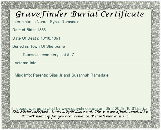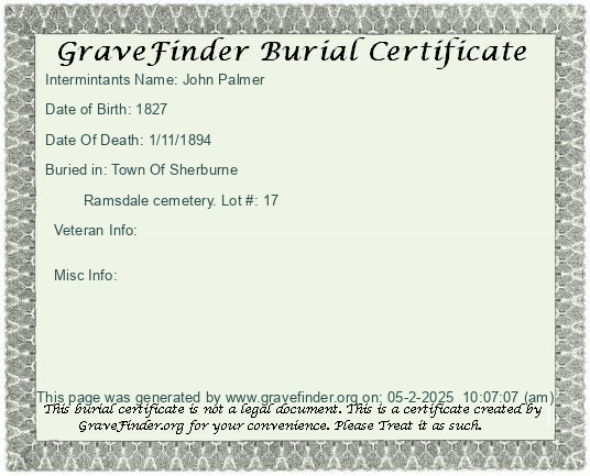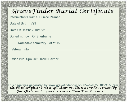 Misc Info: Spouse Silas Ramsdale; Father: Noah Palmer