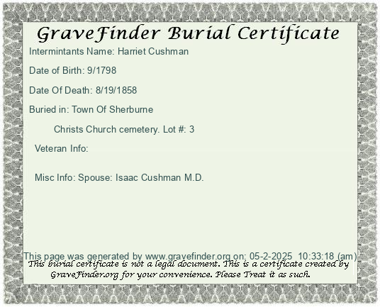Misc Info: Spouse: Charles Babcock. Parents: Dr Isaac and Harriet Cushman form Geneva, NY
